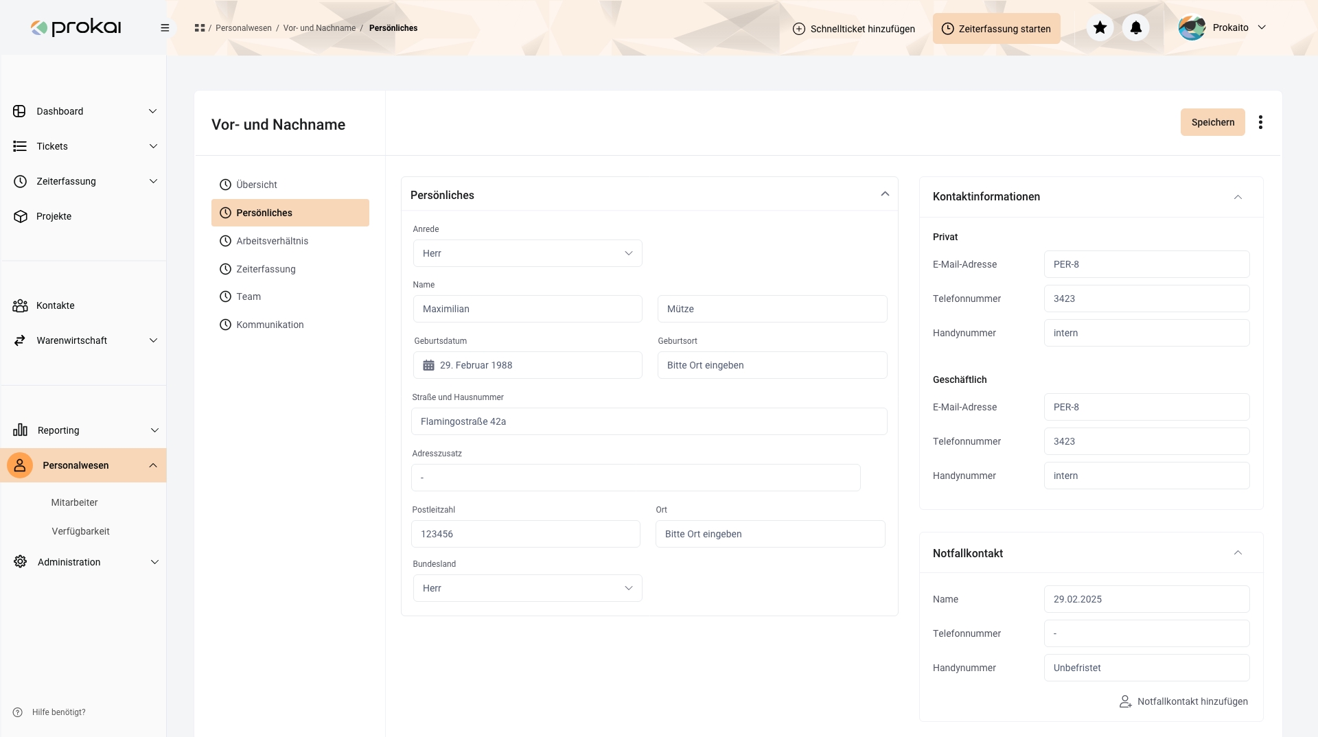 Erleben Sie mit prokai die Vorteile eines vollumfänglichen 360° Mitarbeiterüberblicks, der nur möglich ist, da sie angelegte Mitarbeiter direkt in prokai mit operativen Vorgängen und Prozessen verknüpfen können: Behalten Sie über die Personalakte hinaus alle relevanten Mitarbeiterdaten im Blick. Von der geleisteten Arbeitszeit, über zugeordneten Tasks und Tickets, bis hin zur tagesaktuellen Übersicht über verrechenbaren Stunden.