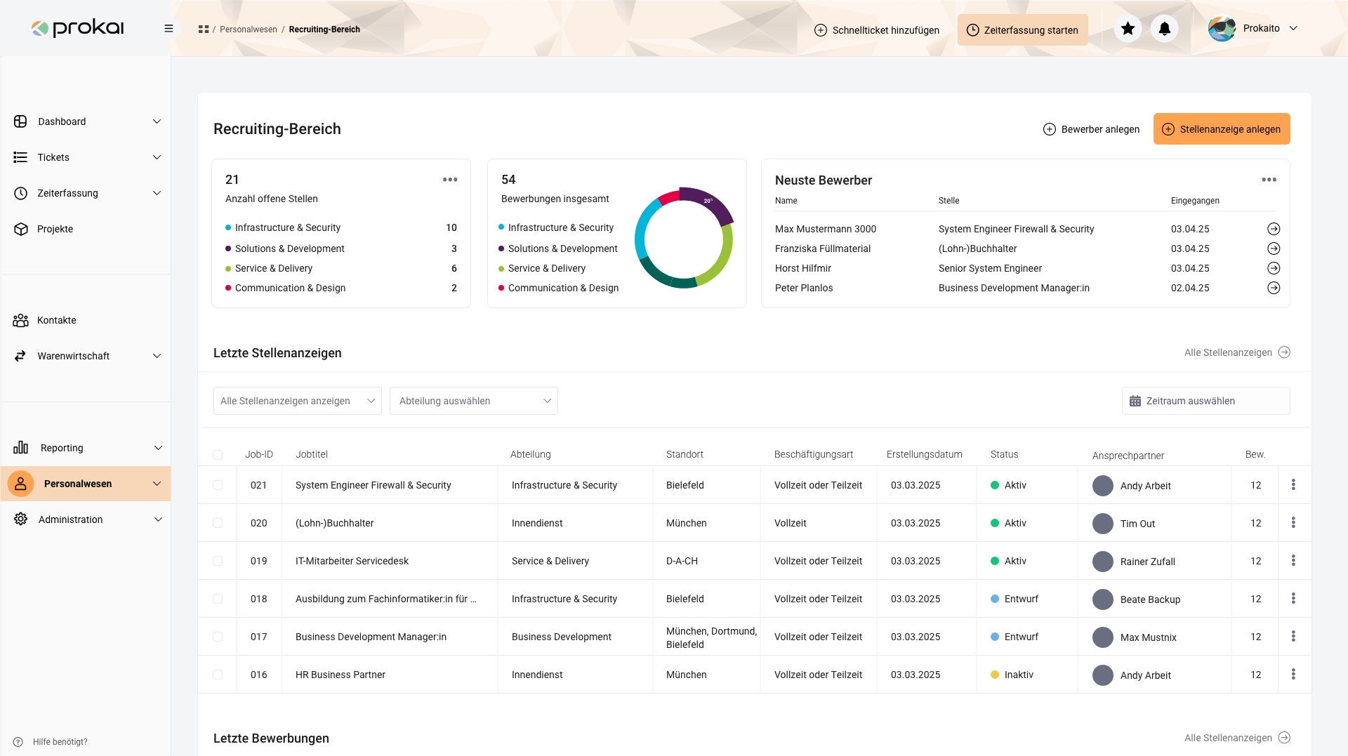 Zentralisieren Sie Ihren Recruiting-Prozess genau dort, wo Ihre HR-Daten sowieso schon liegen: Direkt in prokai! Von der Erstellung und Veröffentlichung Ihrer Stellenanzeigen, über die Bewerberverwaltung bis hin zum Anlegen eines eigenen Talent-Pools. Jemanden eingestellt? Dann wandeln Sie den Bewerber mit wenigen Klicks in einen eingestellten Mitarbeiter um!